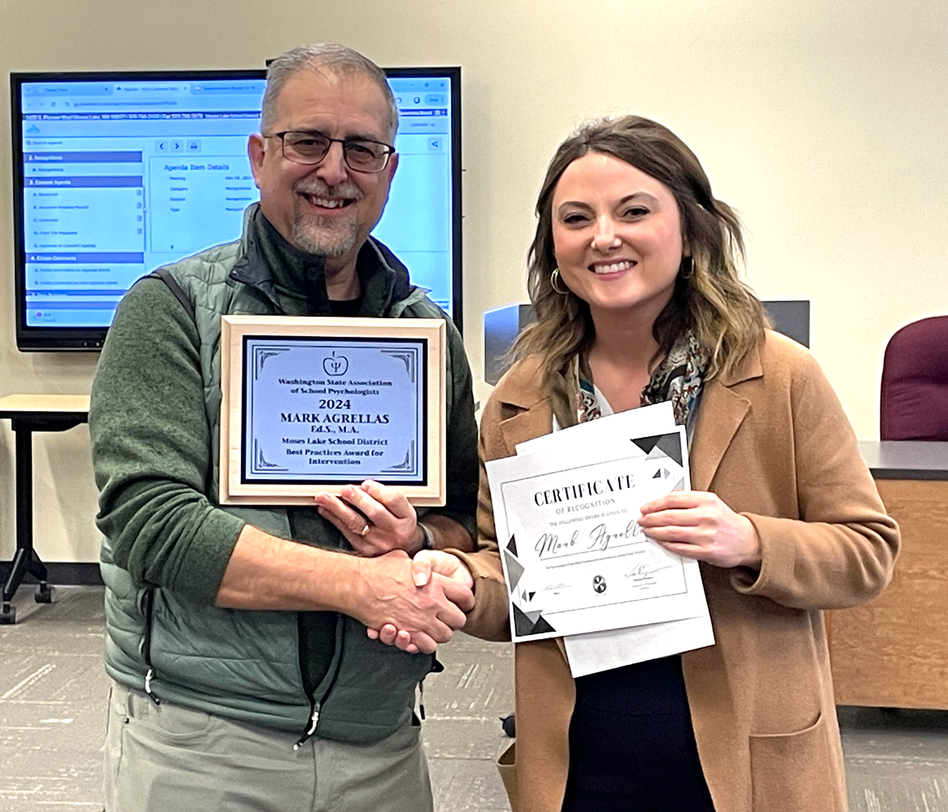Moses Lake, WA – The Moses Lake School District is proud to announce that Mark Agrellas, Ed.S., MA, has been recognized as the 2024 recipient of the Best Practices Award in Intervention by the Washington State Association of School Psychologists (WSASP).